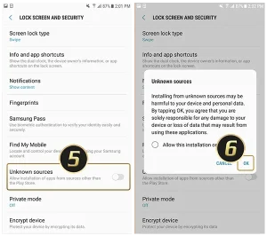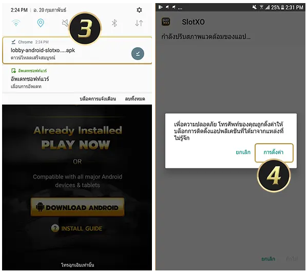 5. หรือจะเข้าไปที่ “ตั้งค่า” >> “ความปลอดภัย” >> “ไม่รู้แหล่งที่มา” >> “อนุญาตให้ติดตั้งแอปพลิเคชันจากแหล่งที่ไม่รู้จัก” จากนั้นจึงจะสามารถติดตั้งแอพได้ จากนั้นรอระบบทำการติดตั้งสักครู่ แล้วจึงจะสามารถเล่นแอปพลิเคชันคาสิโนสล็อตเอ็กซ์โอได้
