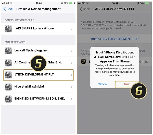 5. จากนั้นเลือก “JTECH DEVELOPMENT PLT” แล้วให้กดปุ่ม “Trust (เชื่อถือ)” เมื่อคุณดำเนินการตั้งค่าในส่วนนี้เสร็จสิ้นแล้ว ให้กดที่ไอคอนแอปพลิเคชันในหน้า Home บนมือถือคุณอีกครั้ง จะเห็นได้ว่าคุณสามารถเข้าใช้งานแอปพลิเคชันคาสิโน SlotXO ได้ทันที ถ้าหากคุณลบแอปพลิเคชัน