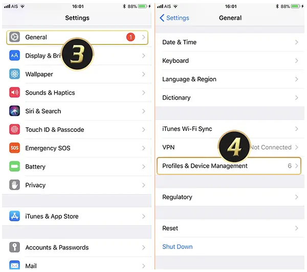 - เลือกที่ ทั่วไป (General) >> การจัดการอปุกรณ์ ( Profiles & Device Managment)